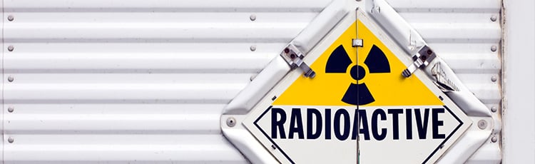 Canadian TDG radioactive placard with the radiation trefoil symbol on a transport vehicle, indicating regulated dangerous goods labeling for safe hazardous materials shipping compliance.