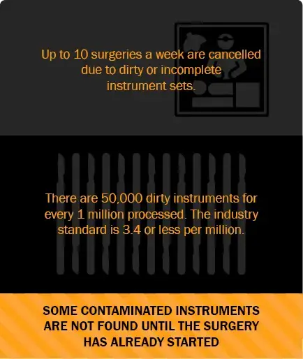 - Up to 10 surgeries a week are cancelled due to dirty or incomplete instrument sets.