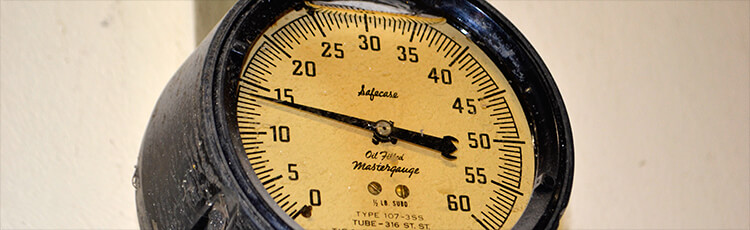 Close-up of an industrial pressure gauge used for NIST-traceable calibration and certification, supporting accurate instrument verification, quality control, and compliance maintenance.