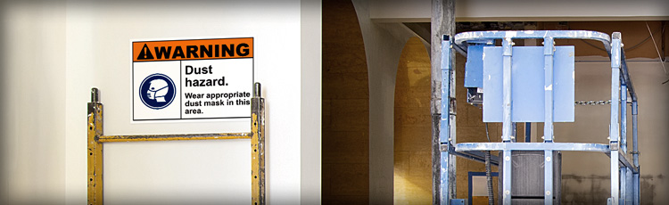 OSHA warning sign posted at a construction site stating “Dust hazard—Wear appropriate dust mask in this area,” emphasizing PPE compliance and workplace safety signage.