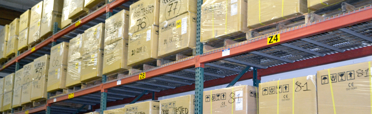 Warehouse pallet racking with clearly labeled locations and staged cartons, illustrating value-added activities like kitting, labeling, and organized order fulfillment in lean logistics operations.