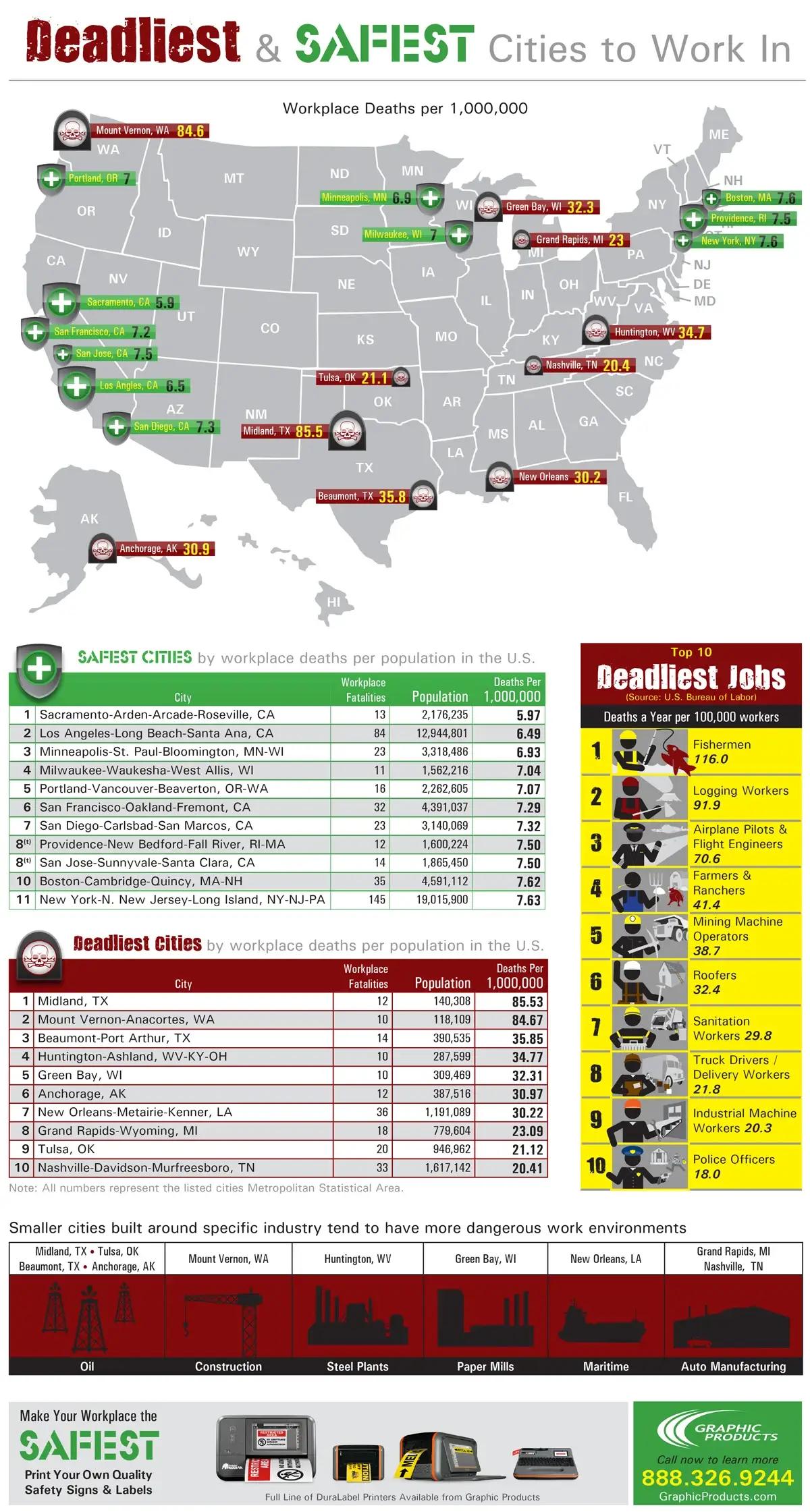 Some of the safest cities to work in have the least amount of deaths on the job per capita. Smaller cities in which their economies focus on a specific industry tend to have more workplace deaths.
